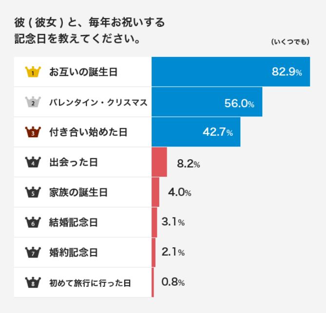 ダントツの1位、82.9%のカップルが「お互いの誕生日」をお祝いすると回答しました。ここは流石に大半の方が毎年必ずお祝いしているようです。