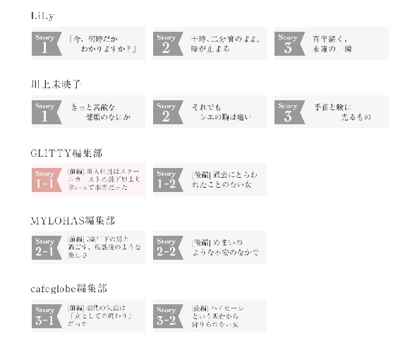 人気雑誌「Sweet」や「NYLON」で連載を持つ人気女流作家のLilyさんや、芥川賞作家の川上未映子さんとコラボしたショートストーリ。