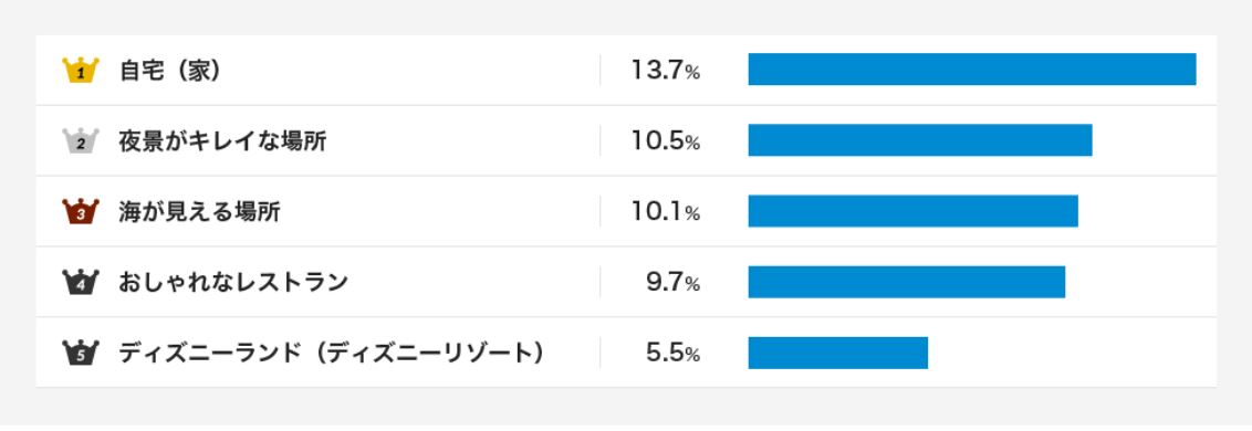 なんと! 最も多かった回答は「自宅(家)」(13.7%)が、「夜景のキレイな場所」「海が見える場所」をおさえて1位でした。