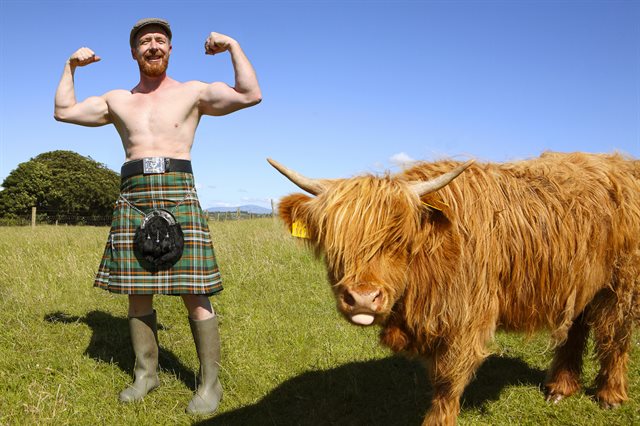 民族衣装キルトがワイルド!隣の長毛ハイランド牛もっとワイルド!