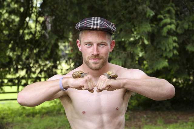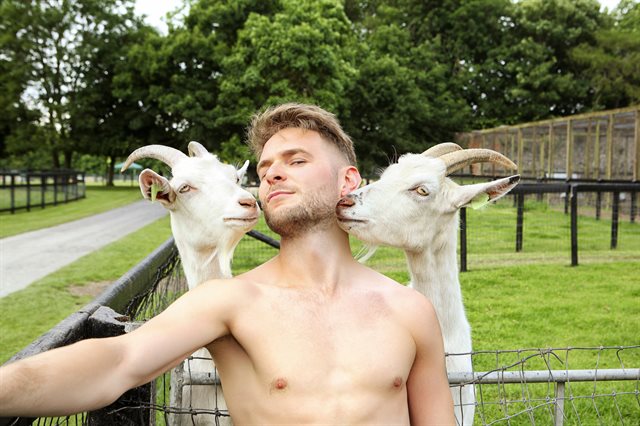そのワイルドなボディーと一緒に映る可愛らしい動物たちがシュールなこのカレンダー。