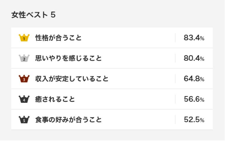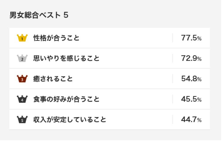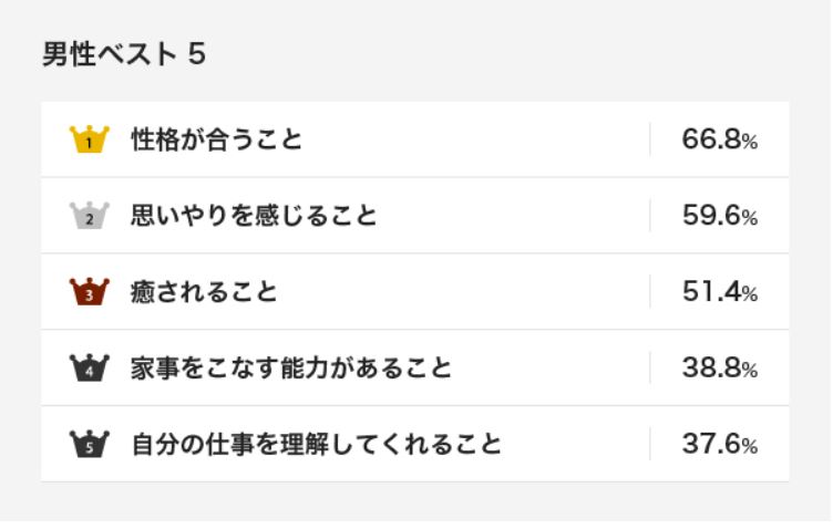 とはいえ、「性格が合うこと」、「思いやりを感じること」、「癒されること」のトップ3は共通と