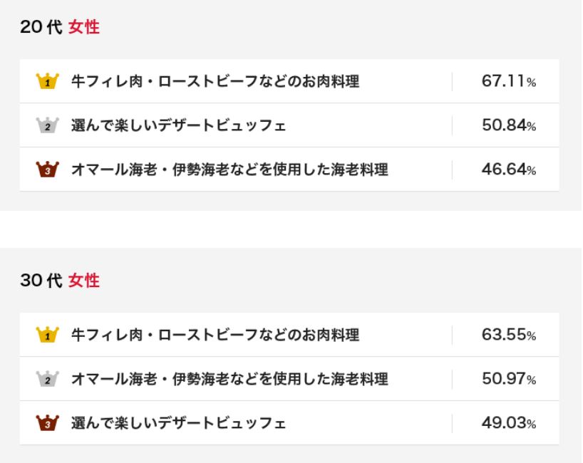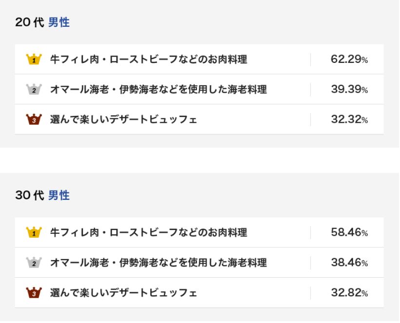 肉料理」、「海老料理」、「高級食材」の順です。総合ランキングでは4位だった「高級食材」が3位にランクインしているのがわかります。男性にとって「高級食材」は魅力的に映るのかもしれませんね。