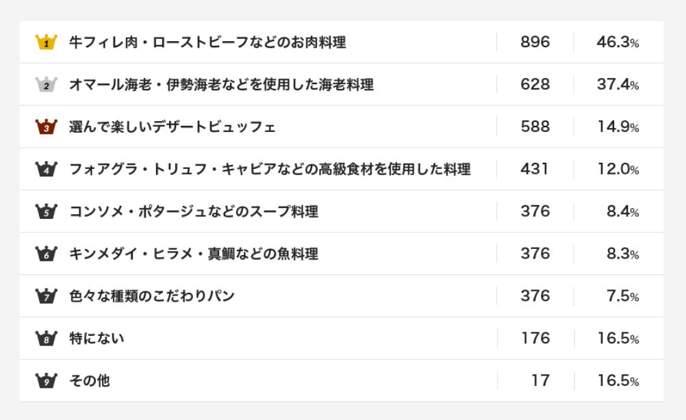 少し意外だったのは、「高級食材」のお料理が、3位の「デザートビュッフェ」に大きく水をあけられて4位となったことです。
